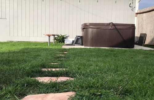 Bedrooms 1 and 2 are equipped with cozy queen-sized beds, nightstands, and dressers. The third bedroom is a bunk room with two queen-sized beds and an en suite bathroom. The living room couch converts into a bed for two, and there is also an air mattress available for two additional guests. The main bathroom includes a tub/shower combination for a relaxing cleanse after a day at the beach. In the backyard, guests can enjoy a large fire pit, a BBQ grill, and a serene 6-person hot tub with adjustable LED lights and a soothing waterfall feature.