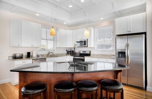 The main floor is on the 1st level. This floor houses 4 bedrooms (sleeps 12) 3 bath, living room and access to the beach. 2 bedrooms are primary suites that have en-suite bathrooms while the other 2 bedrooms sport bunk beds (4 twin in each room) with 1 shared bathroom as well as a pull out sofa (sleeps 2). The laundry room is located just inside the front door for accessibility. This is also the 1st stop for the elevator.