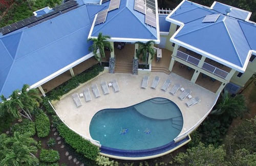 Caribbean Castaway is a six bedroom, solar powered 'green' villa on a one acre water front piece of heaven. High vaulted natural Cypress ceilings, large glass windows and doors, comfortable interior furnishings create the perfect island atmosphere. Art work by local Caribbean artists include Guy Harvey, Elaine Estern and Jonna White are featured throughout the villa. The Mahogany front door, hand built and carved by a local artist is one of the architectural focal points of the house . The gourmet kitchen features Bosch appliances, granite counters, two refrigerators, stand alone ice maker and is fully equipped to cook a gourmet meal for 12 or simply reheat leftovers. For your entertainment, satellite tv and a separate media room with a 55' flat screen television and surround sound, complement the main living area. High speed totally secure Wi-Fi is provided for continued access while away. Additionally, there are hard wire Lan connections in the Bedrooms and Office for even more security.