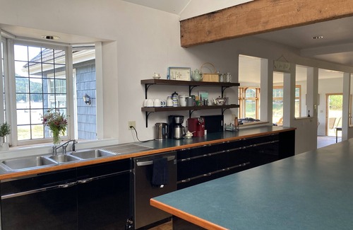 Large beach house on 10 acres, all bedrooms have an ocean view. We have 650' of ocean front that you can just walk out onto the small pebble beach. Swimmable bay. The house is well setup for a large family, especially the giant kitchen!