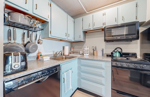 Take the elevator up to the third floor to find this thoughtfully remodeled condo, beautifully positioned, so its shaded balcony overlooks the ocean coast. There's a compact kitchen with every essential appliance, a small dining table, and a light-filled living room with charming decor and a streaming-capable TV. Additional amenities include an ocean-view bedroom, air conditioning, and high-speed WiFi.