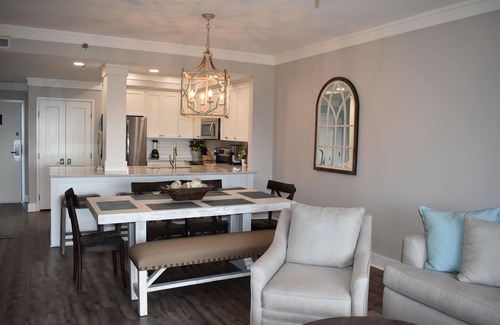 This beautiful two bedroom, two bath beach condo at The Summit at Tops'l Beach and Racquet Resort has everything you desire for a relaxing beach getaway. Completely renovated and professionally decorated in late summer 2018. All rooms are decorated with new furniture, crown moulding and tasteful artwork. Laminate floors and ship lap wall accents are installed throughout. All bathrooms include new vanities with quartzite tops, beautiful tiled showers, new fixtures and hardware. Our kitchen includes new stainless steel appliances and a sprawling quartzite counter top, and full-overlay kitchen cabinets. We also have a new full size, front-load washer and dryer. The large master bedroom has a king size bed with a new premium luxury mattress, 55" flat-screen Samsung wall-mounted 4K Ultra smart TV and wireless Bluray player. The guest bedroom has two full size beds, with new premium luxury mattresses, and a 55" flat-screen Samsung wall-mounted 4K Ultra smart TV and wireless Bluray player. The living room has a sofa bed, and a 65" flat-screen Samsung wall-mounted 4K Ultra smart TV and wireless Bluray player. The dining area seats six and we have WiFi service throughout. Our balcony faces the ocean and provides a stunning view of the Gulf of Mexico where you can frequently watch dolphins.