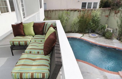 With breath taking ocean views and great open spaces enjoy the luxury of a beautiful Cape Cod open floor plan home where warmth and sunlight are abundant . It is within walking distance of the beach and 10 min. from LAX. Situated upon a quite street in the desirable Hill section, the home has TV’s throughout and panoramic doors that lead to the spacious pool area. This 4300 sq oasis is perfect for relaxing. There are Fireplaces in the Living Room and Master Suite, with a gorgeous fire-pit next to the pool. Upstairs the Master Suite is a sanctuary of calm and tranquility. The guest suite can sleep 2 ; the 2 downstairs bedrooms can sleep 4 and have 2 shared bathrooms. Upstairs the Kitchen has a large granite-top central island with bar stools and a oversized cozy Breakfast-nook area. There is also a ½ bath off the kitchen. The well appointed family room opens to the Kitchen area with a plasma TV and comfortable couches. The BBQ on the deck off the Kitchen overlooks the Pool area, with chaise lounges for sunbathing. The Pool area has an abundance of patio furniture for the perfect zen feel. The Laundry room has a Washer/Dryer/ironing board and complete linens. There are 3 parking spaces in the driveway and plenty of street parking along the wrap-around porch with a large grassy knoll.