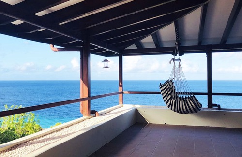 Villa Cas Abao is situated on a hillside and positioned on a slight angle to make the most of the crosswind breeze. A large west-facing covered terrace overlooks the Caribbean Sea and the bright blue water of the surrounding bay.