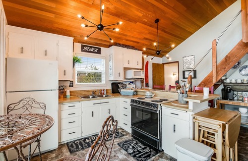 Salty Kisses is a two-story home. Inside this charming home, guests can relax on the sofa after a full, sun-filled day at the beach. Watch your favorite TV shows on the 48" TV with Roku and enjoy a variety of free channels, or gather the whole group for a movie night. There is also a game table for friendly competition. You will find another living room upstairs with a sofa and another 48" TV. When the group gets hungry, gather in the kitchen to take advantage of the well-appointed appliances and cook something delicious - a Keurig machine, coffee press, microwave, and stove make culinary charms and treats a breeze. Dine at the breakfast bar or bistro table and enjoy the views from the expansive windows. Upstairs, the loft offers an ideal setting for catching up on a good novel, and it's a great hang-out space where older kids can enjoy some privacy while watching movies on the TV.