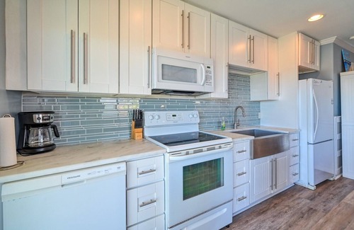 Two Kitchens: Full-lite sliding doors to oceanfront deck, dishwasher, electric range, microwave, stainless farmhouse sink with pull spray tall pot faucet, refrigerator/freezer, custom tile backsplash.