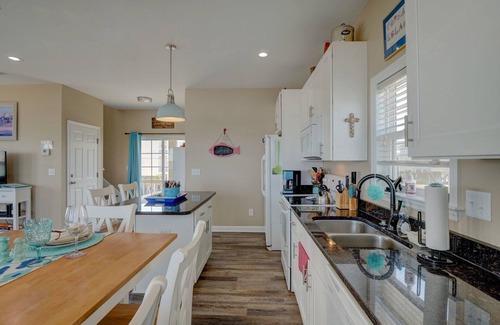 On the main level, the living area features two sofas and a flat-screen TV with cable. Additionally, this floor includes a dining table that accommodates six people and a kitchen island with seating for two. The fully-equipped kitchen comes with modern appliances and is well-stocked to make meal preparation effortless. The second floor presents a king bedroom facing the ocean complete with cable TV, alongside an oceanfront guest room furnished with one full bed and one twin bed, also featuring cable TV. There is a shared bathroom on this level.