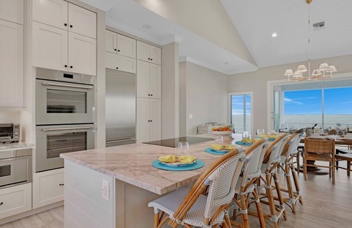OCEANFRONT OASIS is a stilted, one-level home that boasts an open layout with the living room, dining room, and a gourmet kitchen as one space. There’s plenty of seating on the large sectional sofa for your whole crew to gather in the living room for game night or to watch your favorite show on the large flat-screen TV. The beautiful kitchen is fully equipped with high-end appliances and has every tool needed to prepare meals from home. The large indoor dining table seats six comfortably, with four additional seats available at the kitchen bar; open the sliding door for another eight seats on the covered porch.