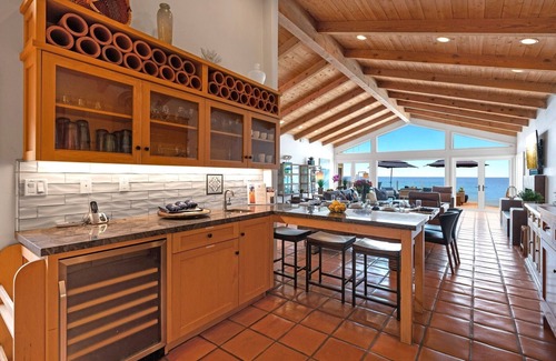 From the courtyard, you will enter the home through a foyer and into the great room with a 15′ open-beamed ceiling. Saltillo tile flooring and tasteful furnishings create a wonderful space to gather and spend time together. and you’ll find your eyes drawn to the large bay windows that frame the spectacular and expansive views of the ocean and coastline.