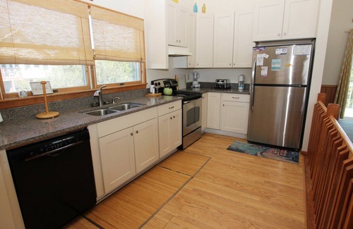 Top Level: Great room with flat-screen TV/Blu-Ray DVD/VCR, wood fireplace and deck access, full hall bath, kitchen with counter seating 5 and the dining area with 2 tables seating a total of 13 and deck access.