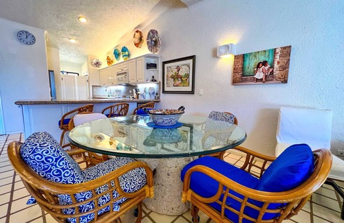Kick back and relax in one of the resort's largest units—a spacious 3-bedroom, 3-bath condo that sleeps 8 comfortably. The open-concept design lets natural light stream in through large glass doors that lead to the balcony, creating a seamless indoor-outdoor vibe. You'll enjoy stunning ocean views from nearly every room, plus a private balcony with cushioned sun loungers and a dining table perfect for catching those amazing sunset views. With cozy furnishings and colorful Mexican flair, this condo feels like home as soon as you walk in. When it's time to unwind, sink into the sitting area and catch a movie on the Smart TV.