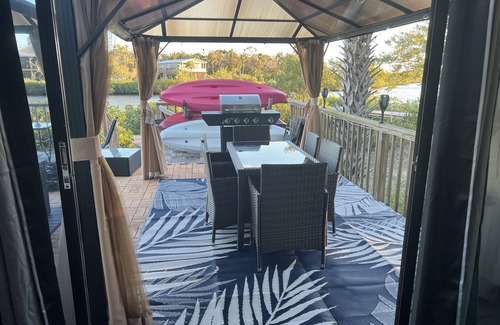 Devastated by hurricane Idalia in September 30, 2023. This property has been completely remodeled. Everything is new. This bungalow consist 900 ft.² with two bedrooms. Nestled on an estuary where the river meets the sea you can literally watch the water flow under you. All rooms have waterviews. This Old florida style home located in Ozello Keys is located near restaurants and several natural springs. People from all over the world come here to enjoy swimming with Manatees and world class fishing. Scallop season is also a big attraction. The beautifully decorated bungalow has 2 bedroom and one bath, granite countertops and screened front porch with outdoor furniture. However, don’t let the size fool you. Most attractive about the home is the back deck with fire-table, gas grill, fire pit, and private dock. The deck has two beautiful gazebo’s equipped with privacy coverage and screen closures to keep out the mosquitoes. Included are 3 kayaks for your enjoyment. You can also fish off the dock. Use our traps to catch fresh Blue Crabs right off the dock. Locals here are very friendly. There are 3 flat screen TVs with Firesticks/Roku. Use them to access Netflix and other Apps. Free Wifi included. Enjoy this diamond on the rough. NOTE: The property is close to the gulf and the water is tide dependent. It can get very shallow. Guests that choose to dock their boat on my dock do so at their own risk. There is plenty of room to park in the driveway. There are also several ramps nearby and a marina 5 mins away where you may dock for the duration with very reasonable prices and services.