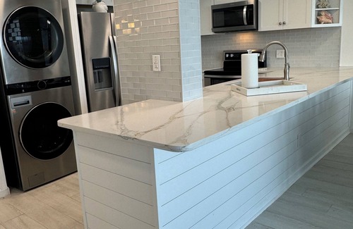 Enjoy cooking in the fully equipped kitchen that delivers quartz countertops and new stainless-steel appliances, all while taking in the views of the Atlantic Ocean through the floor-to-ceiling glass windows.