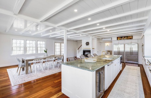 As you step through the front door of this luxury Cape Cod retreat, you're immediately greeted by an expansive great room, where original 18th century exposed wood beams stretch across the vaulted ceiling, adding rustic character and architectural charm to the elegant space. Sunlight pours through large windows, illuminating the open layout that flows effortlessly from the sophisticated living areas to the inviting dining space and gourmet kitchen. With cozy, coastal-inspired furnishings and a warm fireplace as the centerpiece, this space is perfect for intimate gatherings, family game nights, or relaxing after a day at the beach.