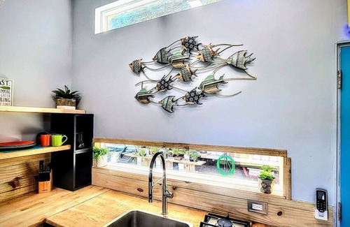 The Sunshine Shack is latest edition to Orlando Lakefront tiny house community! It's the first of 14 vacation rentals with a colorful Beach vibe. Enjoy sitting outside and watching the nature, on beautiful Lake Fairview a bird sanctuary or take out one of our complimentary paddle boards or kayaks. There's a restaurant on the lake about a 20 minutes paddle away or just drive the short half mile. Lots of things to do within community volleyball, grilling a fire pit, two fishing docks, ext..