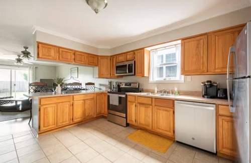Inside, you’ll have a full kitchen for any of your cooking needs. Guests can sleep in the 2 bedrooms, plus the living room comes equipped with a queen-sized sofabed. The living room contains a new smart TV, and the house has Wi-Fi.