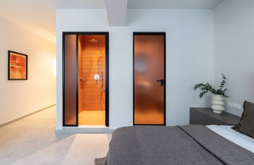 Ouranos is a vibrant and inviting suite that blends color and modern elegance. Featuring a plush double bed, a chic seating area, and a compact kitchenette, it’s thoughtfully designed for comfort and convenience. The spacious bathroom offers a luxurious retreat with premium fittings, while soundproof windows ensure tranquility. A serene haven in the heart of Athens, perfect for a memorable stay.