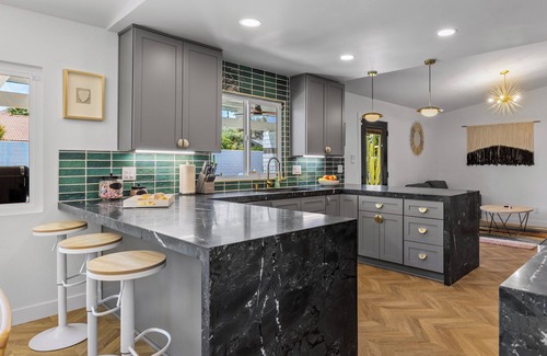 Inside, the home balances elegance with comfort. Herringbone parquet flooring and a striking brick feature wall with mirrored fireplace surround add character, while bold artwork brings a sophisticated touch. A cozy den with a flatscreen TV and plush seating connects seamlessly to the kitchen, which features waterfall countertops, stainless steel appliances, and a breakfast bar for three. The glass-top dining table seats six, making it easy to share meals together in style.