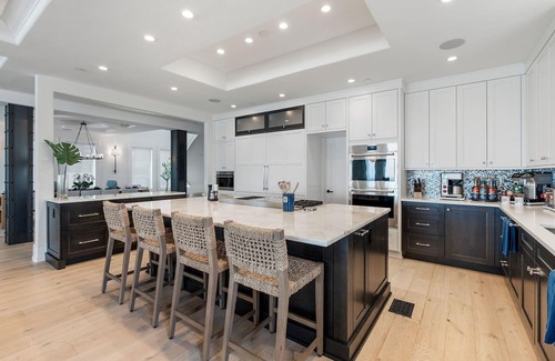 Inside, the home's chef-grade kitchen is equipped with premium appliances and a spacious layout ideal for entertaining or private chef service that can be coordinated by request. Elegant finishes like marble fireplaces*, custom stonework, and lighted tray ceilings are complemented by designer furnishings that elevate every gathering, from cocktail hour to game night.