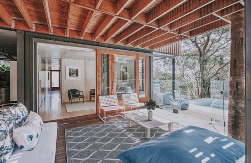 45 minutes from the CBD, Palm Pavilion offers a boutique escape for connecting with loved ones or working in peace. This award-winning, multi-purpose container house is built on the edge of Ku-ring-gai Chase National Park, with a luxury feel and mindful architecture that centers on sustainability, seclusion and tranquility. Offering floor-to-ceiling rainforest views and a full suite of amenities, Palm Pavilion is an oasis for cutting out noise and sharing what matters.