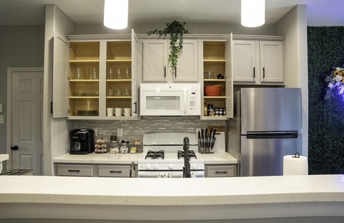 Fully equipped kitchen with stainless steel appliances, granite counter tops, and essential kitchen items ( blender, toaster, Keurig, etc...) Premium pots and pans for cooking. Coffee bar is fully stocked with a variety of options from tea to coffee. Drip coffee as well as K-cups available. Seasonings and spices for your personal use.