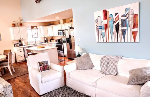 Also on this floor: furnished front porch, bedroom with King, bedroom with two Full beds, Bathroom with easy step-in shower, laundry closet.