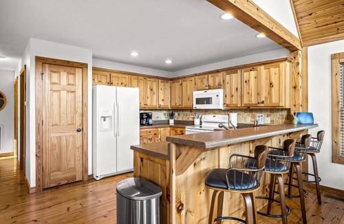 Cook with ease in the well-stocked kitchen—pots, pans, dishware, utensils, and coffee bar included. The main dining table seats 8, plus 4 more at the kitchen bar. Whether you’re preparing a big breakfast before hiking or grilling dinner on the deck, everything you need is here.