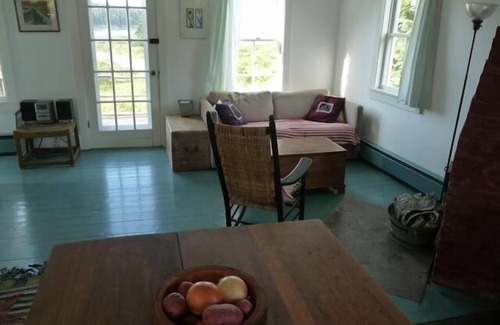 This classic Maine summer home is located steps away from a sandy beach in a quiet cove, perfect for swimming and for young children. Grassy meadows surround the house, which has views of the ocean on three sides. The kitchen/dining/living area is comfortable and light. A wood stove can warm the house on cool evenings and in colder months. In the summer, doors open to a wrap-around porch, lovely for outdoor lunches or breakfasts. The first-floor corner bedroom has a queen bed and views of the ocean on two sides. The second floor front bedroom has a queen bed and a writing desk and offers views of the ocean and surrounding island. The back bedroom has a double bed and a single bed with views of the meadows. Twenty-five acres of meadow, woods, and pink granite shorefront invite leisurely afternoon strolls.