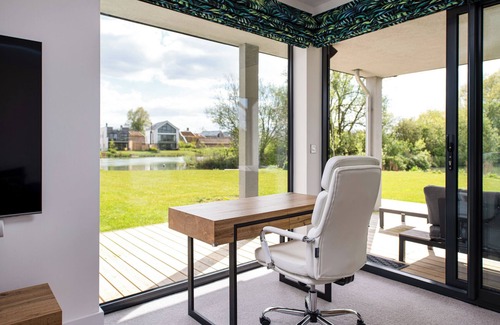 Peninsula is a unique L-shape with a south-westerly orientation, the combination of a large open-plan living space with full sliding doors opening onto a wraparound decked area by the water's edge creates a seamless transition between indoor and outdoor living. The large decking area boasts a hot tub, BBQ, and bioethanol fire pit, making the outside space perfect for entertaining or simply enjoying the natural surroundings in comfort and style. Peninsula boasts a large garden and a private jetty giving access to the lake.