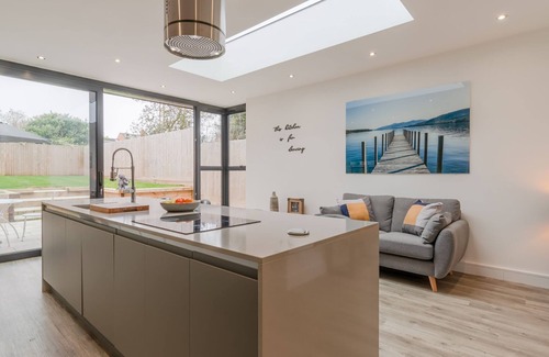 Percy House is in a residential area, at the end of a quiet cul-de-sac just north of the centre of the famous medieval market town of Stratford-upon-Avon. The house has recently been refurbished from top to bottom, outside and in, while retaining its 1930's features, including the front door's Art Deco stained-glass. At the front is a gravelled parking area for two cars. A side gate opens to a path leading to a south-facing patio and garden - a secluded and private suntrap that is accessed from the inside through the kitchen-dining room's sliding doors. The patio has a BBQ and outdoor dining table and seating for six, providing a fabulous space to enjoy al fresco drinks and meals.