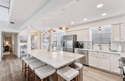 The fully stocked kitchen makes meal prep a breeze, featuring a large island with seating for six, a prep sink for convenience, and all the essentials—including coffee, spices, foil, plastic wrap, Ziplocs, and more—so you can spend less time shopping and more time enjoying your vacation.