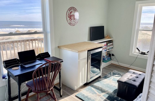 — King Beach is a master suite with an attached bath, direct access to back deck, and a view of the ocean. It contains a dresser, a free-standing open closet with hangers, a chair, a bench, a folding luggage rack, a fold-out twin sized cot, two nightstands with lamps containing an outlet and a USB plug in the base, and a wall mounted folding desk.
