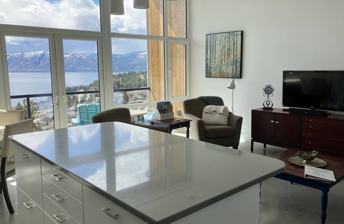 Perched high on a Peachland hillside overlooking Okanagan Lake and surrounded by mountains, sits the Loft. Unique and architecturally designed, the Loft offers the perfect location for your special getaway. The spectacular view through the floor to ceiling windows is ever changing with the seasons. The kitchen is well equipped with a gas stove, fridge, dishwasher and microwave. It has everything you need to make great meals from fresh food found at the local markets. There is a comfortable king size bed with quality linens that awaits after a day of hiking or wine tasting for a relaxing night’s sleep. The bathroom features a walk in curb-less shower with high end fixtures. The open plan living/dining area has a queen size hide-a-bed for extra guests, TV, Bose sound bar and comfortable chairs for lounging. Our hot tub is just steps away, with a great view of the valley and is ideal for star gazing at night. You have your own balcony with BBQ, plus another patio with a hammock just outside the entrance. The Loft was designed to give you privacy from the main house, but you may see an occasional deer out your bedroom window. Please read through some of our many reviews for more insight into this one of a kind retreat.