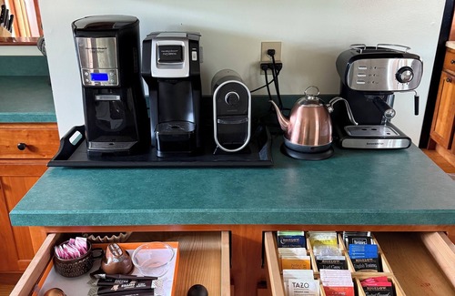 The kitchen is well-stocked with pots and pans, baking sheets, utensils, dinnerware & silverware, and tools. The centerpiece is an antique stove converted to propane, but guests can also use the wall oven, microwave, induction cooktop, and toaster. Morning coffee rituals can be satisfied with an espresso maker, drip coffee pot, moka pot, Keurig, electric kettle, and coffee grinder. An assortment of teas are also in the drawer in front of the coffee station. We provide essentials like salt and pepper. Finally, the well water is safe to drink, and comes from the same source as Geyser Peak bottled water.
