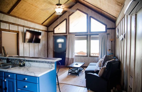Experience a rustic cabin rental on a spacious, fully fenced pet-friendly property. Perfect for families and friends. The Lake Guntersville vacation rental features a kitchen, living room, open loft space, bedroom, and bathroom with outdoor recreation space.