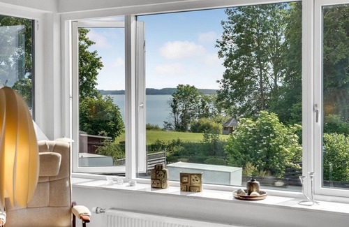 Spacious and cozy cottage on two floors. From the house you have the most beautiful view of Vejle Fjord and the peninsula west of Juelsminde. The house has a spacious dining room. which is in open connection with the spacious kitchen. On the first floor are two of the total four bedrooms and a bathroom with whirlpool. The other two bedrooms are on the second floor, along with another bathroom and the living room, which offers a beautiful panoramic view of the water. There is a nice tiled terrace facing south and in the garden you will find a large covered terrace where you can enjoy nice dinners with the family and find shade on hot days.