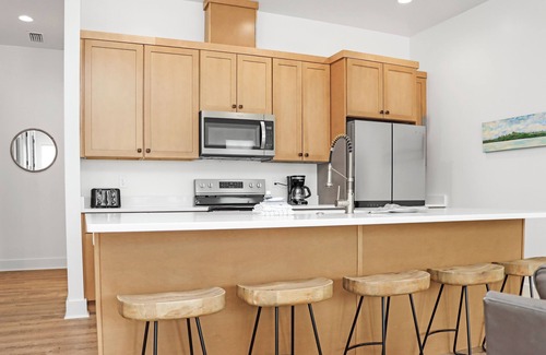 Mint Julep is a delightful ground-floor vacation rental duplex located in the peaceful Marina Cove development in Port St. Joe, just steps away from the breathtaking St. Joseph Bay. This single-story retreat features 2 bedrooms and 2.5 bathrooms, comfortably accommodating up to 6 guests. It is also pet-friendly, making it ideal for families or small groups. The spacious master bedroom includes a king bed, a TV, and a full ensuite bathroom. The second bedroom has two queen beds, a TV, and its own full bathroom. Additionally, a half bathroom is located in the main living area for guests' convenience. The property offers ample parking with four dedicated spots.
