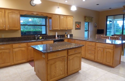 The featured home in Marlwood Estates has a master bedroom with a king bed, guest room with a queen and another guest room with two twins. There is also an office off the Master bedroom with a futon and a private bath in the room. In addition, there is a separate Den.