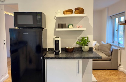 The Annexe features its own front stable door, opening into a charming courtyard with outdoor seating. Inside, you'll find a bright, modern kitchen, fully equipped for your convenience, alongside an adjacent shower room.