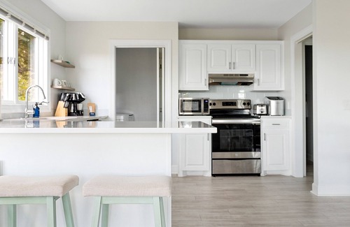 Indulge your culinary passions in the smartly designed modern kitchen, boasting beautiful quartz countertops and ample workspace. Fully outfitted for meal preparation and dining needs, this kitchen is a chef's delight.