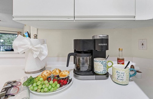 The well-equipped kitchen has everything you need for both short and extended stays, including all main appliances and smaller ones such as a Keurig and regular coffee machines, toaster, blender, kettle, and more. The dining table seats four and can also serve as a workspace if needed. Alternatively, relax on the sofa, kick your feet up, and enjoy a movie or your favorite show after exploring the local area or enjoying the community pool.