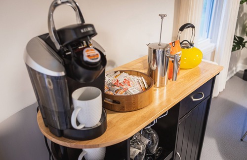 The Pisgah View Place has a fully stocked kitchen, waiting for you to prepare your favorite meal. An adorable retro refrigerator with freezer, microwave, oven, stove top, cutting board, and knife set for your use. Pots, pans, baking sheet, utensils, crock pot, toaster, saran wrap, aluminum foil, cooking oil, measuring cups, and full service for 5. If you're not going to Asheville for brunch- whip up your own-on the waffle iron! Kitchen also boasts a coffee cart- Kuerig, french press, tea kettle, with coffee (bag coffee/Keurig pods) and tea selection.