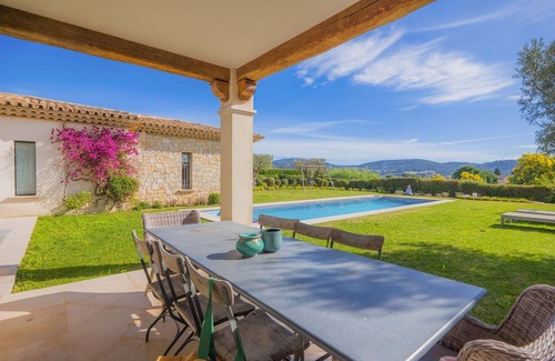 It features a bright and open living space that extends onto a spacious terrace and a landscaped garden. A large swimming pool, perfect for cooling off while enjoying the unobstructed view of the vineyards. A dining area with a barbecue.