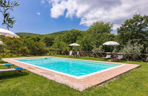 The fenced-in pool, embellished by a beautiful panoramic setting, lies in front of the house which is about 8 m away and can be reached across the level lawn. The rectangular pool measures 6 x 12 m with the depth ranging from 1.40 to 2 m; bordered in stone and lined with PVC, it has chlorine purification and Roman steps for access to the water. The sunbathing area on the surrounding lawn is bordered by hedges and bushes and equipped with sunbeds, deckchairs, small tables and sun umbrellas. The pool will be open from the last Saturday in April to the first Saturday in October.