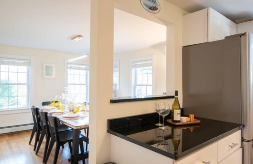 Experience the charm of Chatham in this exquisite vacation home, featuring a total of 5 bedrooms divided between the main house and a quaint guest cottage. Nestled conveniently on Main Street (but without the noise), this newly renovated property welcomes you and the entire family with open arms. Create endless memories in the spacious screened-in barn, perfect for post-dinner relaxation or a friendly game of ping pong. The private stone patio, adorned with a century-old cherry blossom tree, invites you to savor sunset dining on warm summer nights. With seating for up to 12 and a Weber gas grill, culinary delights unfold in the open air.