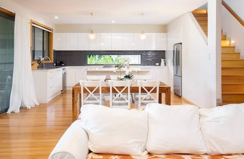 Enjoy the carefree vibe of Blacksmiths. With the coastline just a few minutes’ walk, you can take a dip in the ocean before strolling back to your tropical haven. Spend the afternoons poolside in the cabana or evenings settled in on the lounge with a movie. Four king bedrooms, plus heating and cooling throughout, caters to both groups and families, while light-filled open plan living seamlessly connects to a covered deck overlooking the private backyard and sparkling pool.