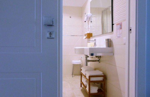The bathroom is equipped with a bidet, a generously sized shower cubicle with RGB chromotherapy lamps, rain showers with thermostatic regulation, wall-mounted hairdryer, heated towel rail, stool, linen rack and courtesy set.