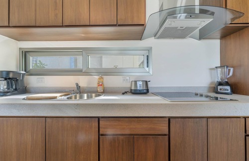 Enjoy your airy and modern air-conditioned, spacious living area with a comfortable sofa/futon. Indulge in this tranquil and quiet escape in the center of all the action on Isla Mujeres. Open your large, glass patio doors from your living area and start your day in paradise with breakfast and a coffee from your balcony or from our ocean view rooftop pool.