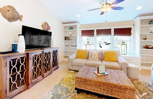 The deck and pergola have two separate seating areas, including alfresco dining for four. End blissful days with a soak in your private hot tub.Make a splash in the neighborhood pool, located a breezy 5-minute stroll from home.