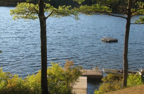 Nestled into the woods at the Southern edge of the White Mountains, our secluded lakefront home and guest house are located on Squam Lake, site of the movie 'On Golden Pond.' The two-cabin compound rests on four very private wooded acres with magnificent views of the White Mountains. The sizable screened porch has a wrap-around view onto one of the lake's most private and desirable coves. The main house, the guest house and a small sleeping porch (converted study) have wonderful sunset views of the lake, and are 35, 75 and 10 feet from shore, respectively. This is a tranquil spot 3 miles from the charming town of Center Sandwich, NH. The rental includes a dock, a kayak and two canoes free of charge. The homes have a washing machine, a washer, a dryer, wifi etc. and all amenities except TV. The house has a lovely large living room with a fireplace, and wonderful picture windows looking onto the lake.